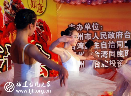 文藝表演從主辦單位工作人員深情合唱:《鼓浪嶼之波》開(kāi)場(chǎng),臺(tái)資企業(yè)“美樂(lè)地幼兒園”老師充滿(mǎn)喜慶的《新春報(bào)喜慶》舞蹈和福州市臺(tái)企協(xié)會(huì)“牽手之家”充滿(mǎn)愛(ài)心的手語(yǔ)表演《我們都是一家人》、青年臺(tái)胞陳寅翾的長(zhǎng)笛獨(dú)奏《菊花臺(tái)》、高山族同胞談張德的獨(dú)唱《蘭嶼之戀》、老臺(tái)胞林江的《祖國(guó),慈祥的母親》的真情獨(dú)唱,個(gè)個(gè)節(jié)目環(huán)環(huán)緊扣,精彩紛呈。由福建省藝術(shù)職業(yè)學(xué)院青年臺(tái)胞陳雯編導(dǎo)的獨(dú)舞《在那遙遠(yuǎn)的地方》、芭蕾舞《謝謝朋友們》的專(zhuān)業(yè)級(jí)表演,為晚會(huì)再添精彩。