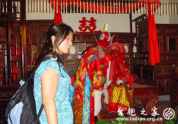 在講解員的帶領(lǐng)下,青年臺(tái)胞們沿著大廳兩旁回廊式的展廳移步觀賞。從“遠(yuǎn)古家園”、“血脈相親”到“隸屬與共”、“開發(fā)同功”,從“文脈相承”、“諸神同祀”到“風(fēng)俗相通”,營(yíng)員們從實(shí)物、圖片、蠟像、雕塑、聲電光展示中感受歷史、感受海峽兩岸同根同源、密不可分。熟悉、濃郁的閩南文化氣息和鄉(xiāng)音鄉(xiāng)俗讓臺(tái)胞青年們倍感親切,帶隊(duì)的老師饒有興趣地說:“閩南地區(qū)女孩子出嫁絞面的習(xí)俗臺(tái)灣也有,只是現(xiàn)在不多了,這可是美容的一種方法呀!”旁邊的臺(tái)灣逢甲大學(xué)的李永源同學(xué)說:“感覺好奇特哦!我祖籍是福建,來(lái)到這里,就好像回到了老家的大厝,一樣的建筑風(fēng)格,一樣的閩南語(yǔ)調(diào),一樣的生活場(chǎng)景,我有了一種回家的感覺耶!”。