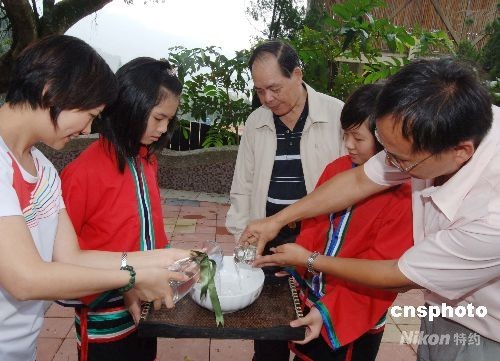下午四點許,在近百名參加“二00八·陽光海峽”兩岸快樂小天使活動營的兩地小朋友的共同見證下,該活動營領隊、福建省廣播影視集團電視少兒頻道總監(jiān)覃曉清,與臺灣南投德化小學校長梁有章在該換水儀式上共同將兩地之水倒入由二位臺灣邵族小朋友手捧的白瓷碗中融為一體,最后分別保存至兩個瓶子中,由閩臺兩地分別珍藏。